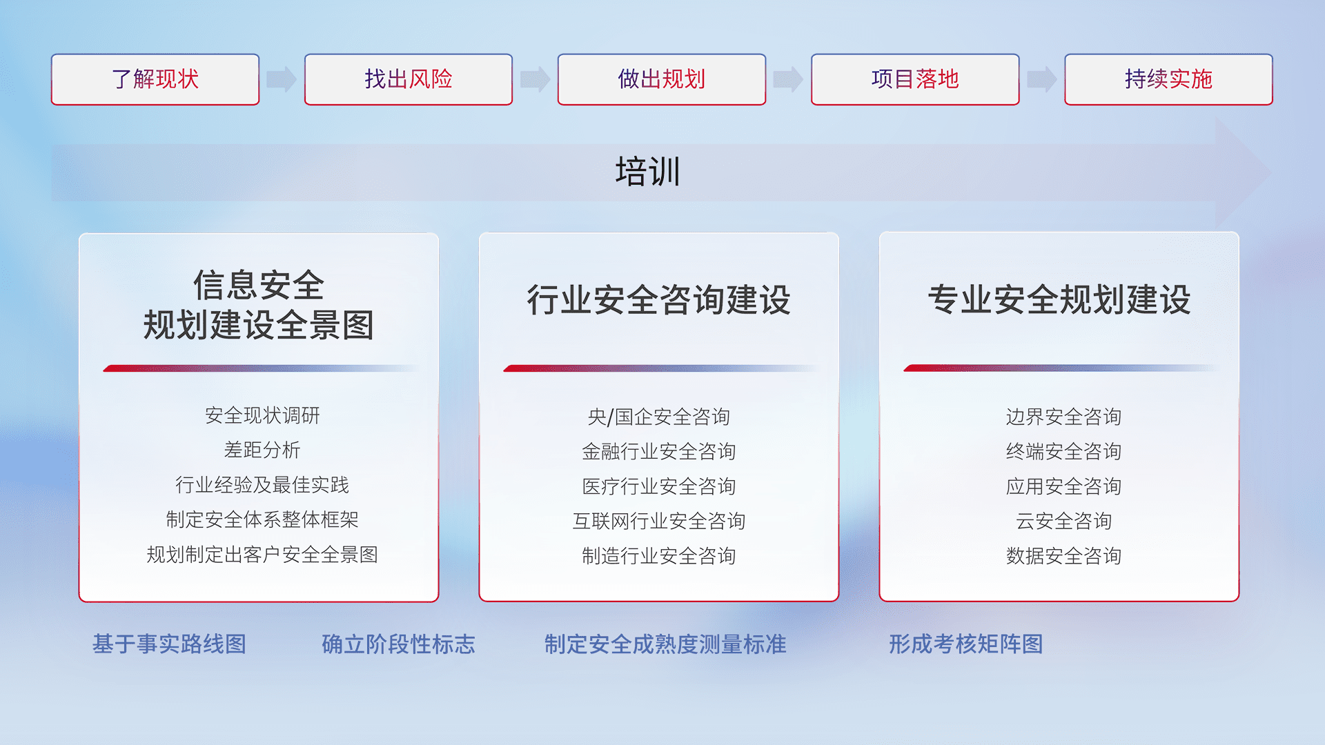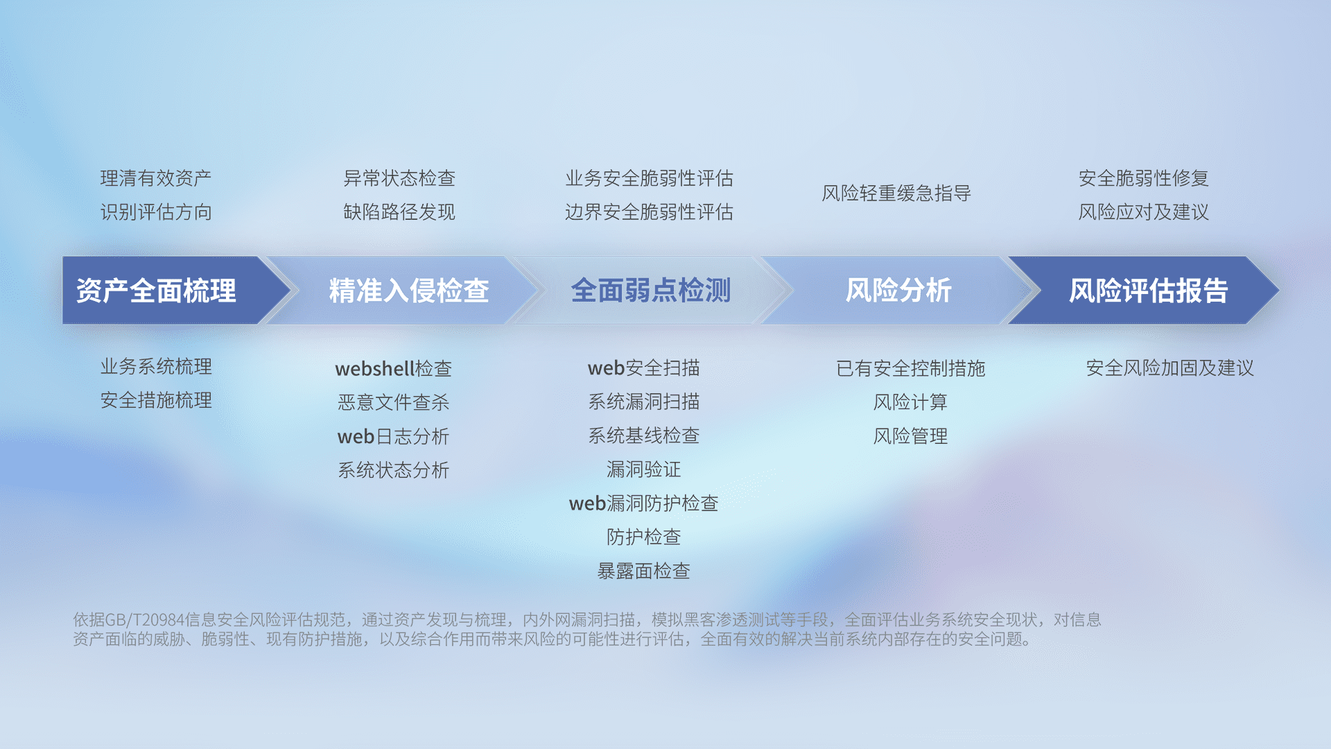 针对客户行业特性,,,,以专业的安全服务+多厂商联合解决方案提供专属的一站式安全管理服务,,帮助客户全面感知网络空间威胁,,,基于识别、、、、检测、、分析、、防护、、监测、、、、响应的服务理论模型,,,,从方案咨询、、、集成交付、、、、评估验证、、、、优化加固、、运维运营,,,,致力于为客户提供完整的闭环管理式安全服务。。。以实战经验为客户打造高抵御风险的安全体系,,,帮助客户发现威胁、、、、对抗威胁、、、、处置威胁,,,不断积累安全对抗能力,,,持续保障数字化安全。。